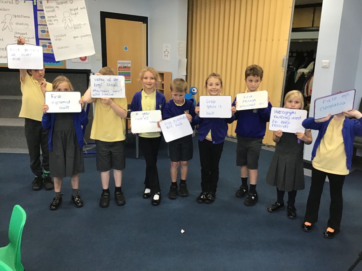 In History, we have been learning about the Ancient Egyptians. Once we had looked at the differences between BC and AD and learned about some key historical events in Egyptian history, the children were given several key events without the dates and had to use their reasoning skills to place them on a timeline. Later, we revealed the correct dates so the children could see how accurate their predictions were.
