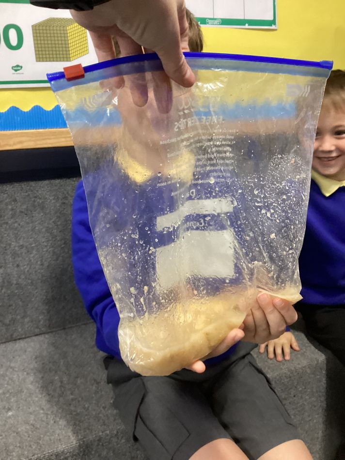 In Science, Shearwaters were looking at the human digestive system. We used a zip-lock bag and a pair of tights to mimic the route food takes through the body. As we went along, we ticked off key vocabulary related to the process.